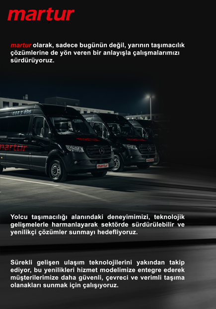 Martur olarak geleceğe sadece araçlarımızı değil, düşünce biçimimizi de hazırlıyoruz. Sadece bugünün değil, yarının ulaşım ihtiyaçlarına da şimdiden çözüm üretmeye devam ediyoruz.